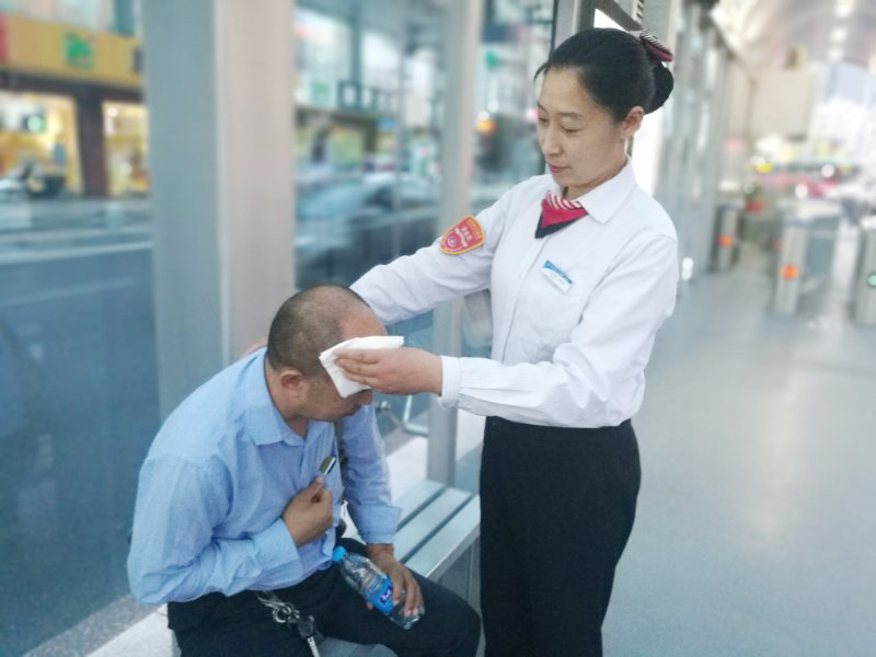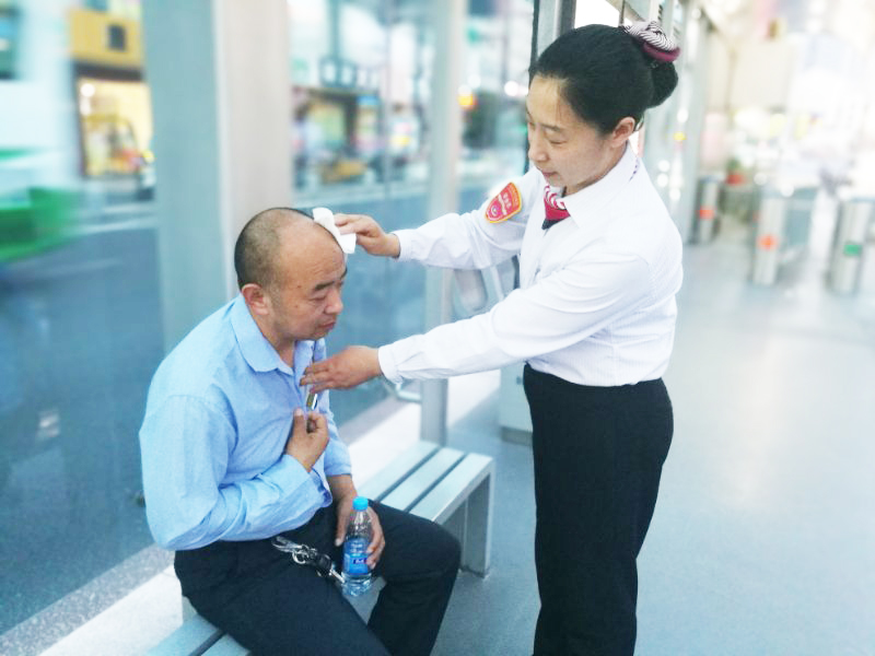 一次,我在移動(dòng)公司站上晚班,有位老人下車后便趴在安全門上,我便用廣播安全提示:“乘客們,你們好,為了您的安全,請(qǐng)您不要趴靠安全門,請(qǐng)您退到安全線后耐心等待。”忽然看見老人倒地,我趕緊攙扶他坐到站內(nèi)椅子上,詢問(wèn)他是怎么了,還沒(méi)開口,他就出現(xiàn)心慌手抖、嘔吐等現(xiàn)象。我趕緊撥打120,同時(shí)也像智能調(diào)度中心報(bào)告站臺(tái)的實(shí)況。等待120過(guò)程中,我一邊幫他擦汗,一邊輕拍他的胸口幫助他呼吸順暢。沒(méi)多久,老人的家人和120前后腳便到了,他的家人激動(dòng)地握住我的手說(shuō):“太感謝你了,多虧有你們,我們家老年人身體一直不是太好,可是又喜歡出來(lái)散悶,今天如果沒(méi)有你在,真不知道怎么辦了。”當(dāng)時(shí)聽了這話,我的心里感受到不一樣的溫暖,內(nèi)心無(wú)比自豪。我笑著對(duì)他們說(shuō):“這是我們應(yīng)該做的,您太客氣了。”
