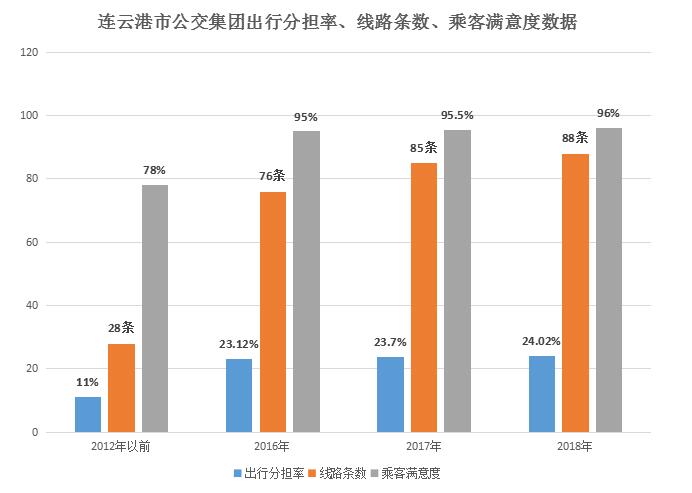 2012年之前,我市運營公交線路僅有28條,車輛數370臺,社會承包車占比70%,車輛空調化率為23.7%,日均客流量為13.29萬人次,出行分擔率為11%,社會滿意率僅為78%。經過六年精心耕作,公交發展指標得到大幅提升。