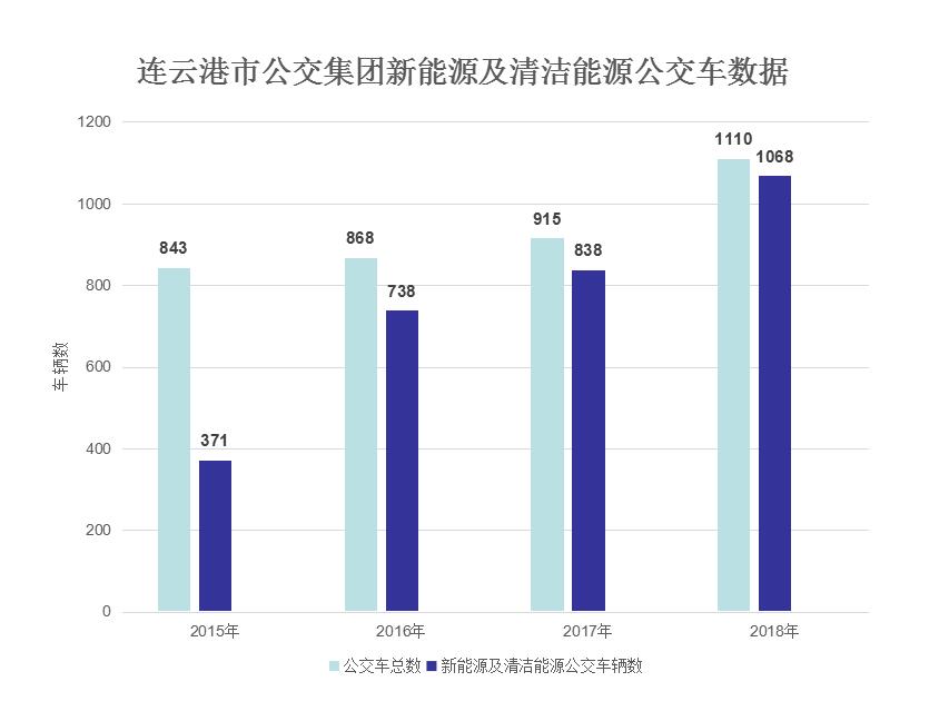 2015年起,連云港市交通控股集團公交集團加快車輛更新步伐,先后購入了1068輛環保公交車(清潔能源公交車371輛,新能源純電動公交車697輛),淘汰下線黃標車輛566臺,年替代柴油量15988噸,減少二氧化碳排放4.86萬噸,節能減排效果明顯,新能源以及清潔能源公交車輛占比居全省之首。